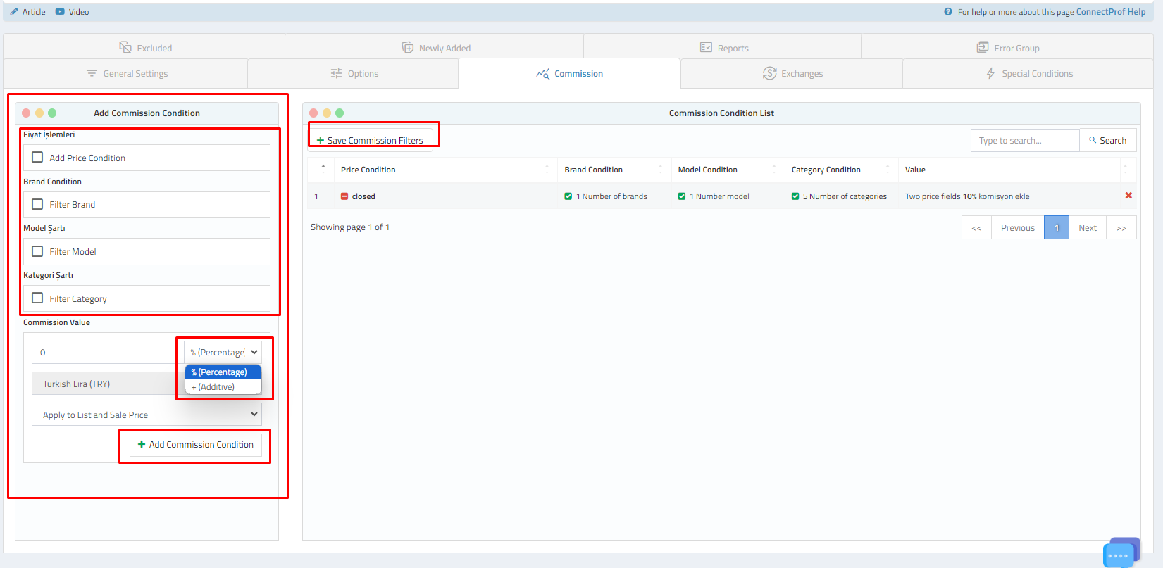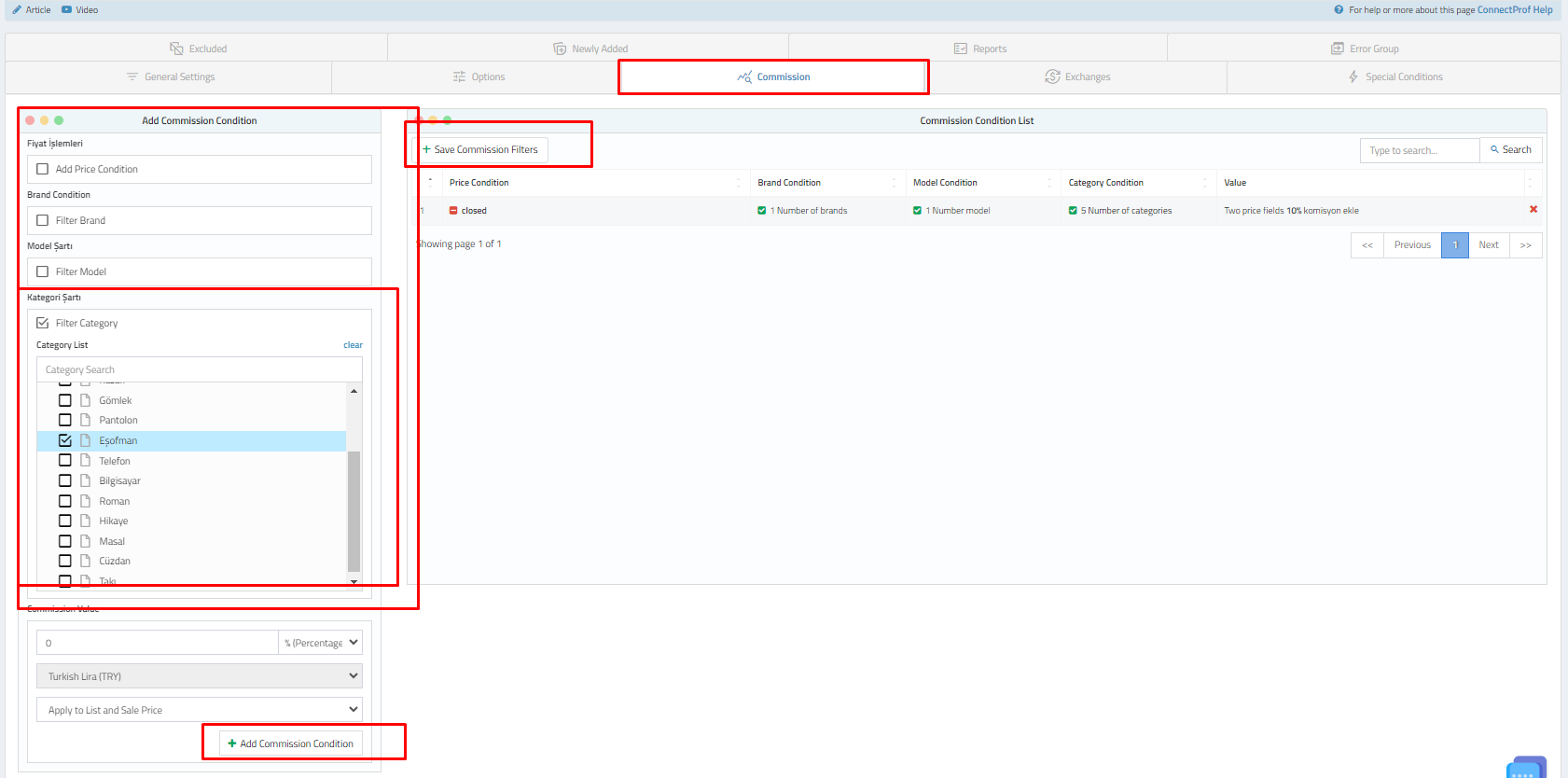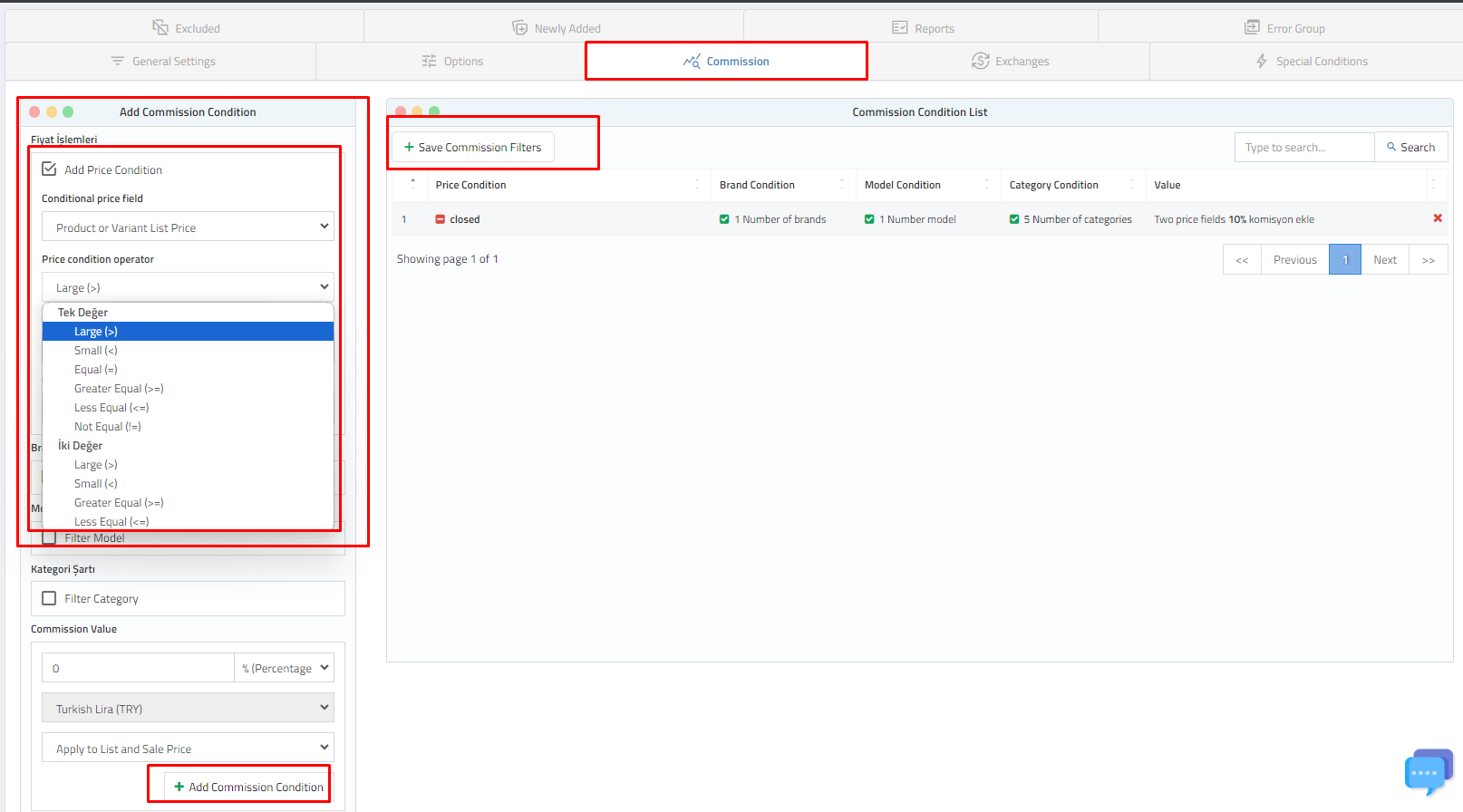 You can add commissions based on price, brand, model, or category from the "Add Commission Condition" section. If you wish, you can also add commissions for specific brands or categories by filtering.