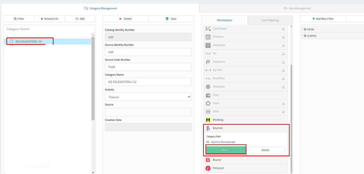 NOTE: Products with missing or incorrect information will be prone to errors on Beymen. Therefore, when performing Category Matching, make sure to fill in all mandatory fields completely.
