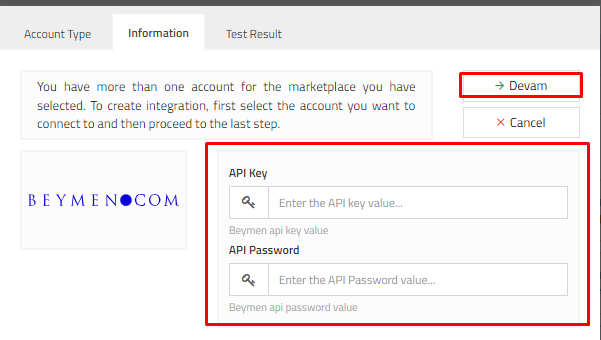 After adding Beymen API information, it is necessary to associate Beymen with ConnectProf integration.