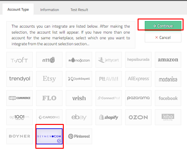 Select "Beymen" from the "Marketplace Selection" window that opens.