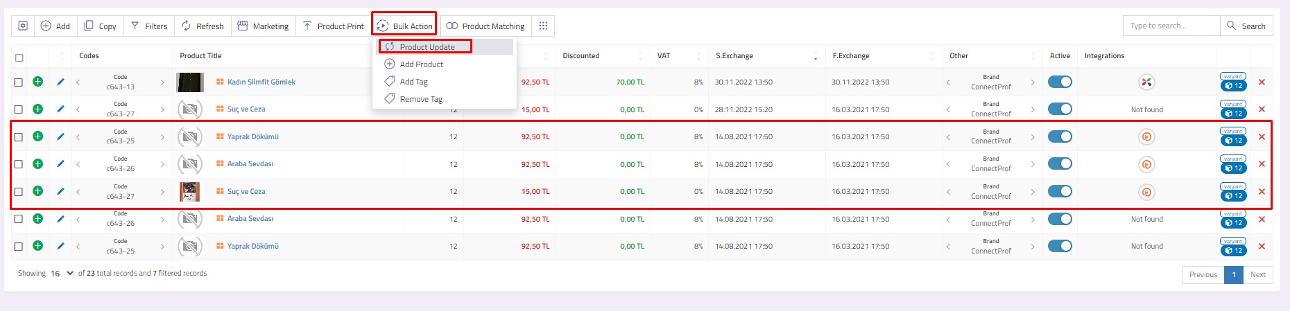 With ConnectProf, you can update your products transferred to the marketplace in bulk instead of updating them manually one by one.