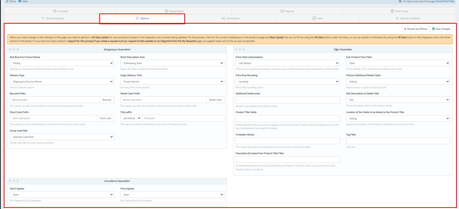 This comprehensive integration with ÇiçekSepeti through ConnectProf allows you to efficiently manage your product
