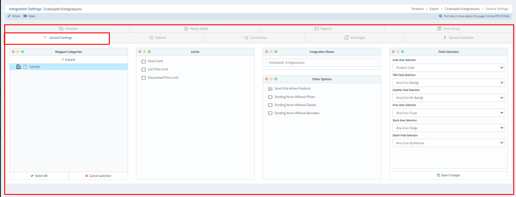 - Map your product categories to ÇiçekSepeti categories using the "Category Mapping" section.