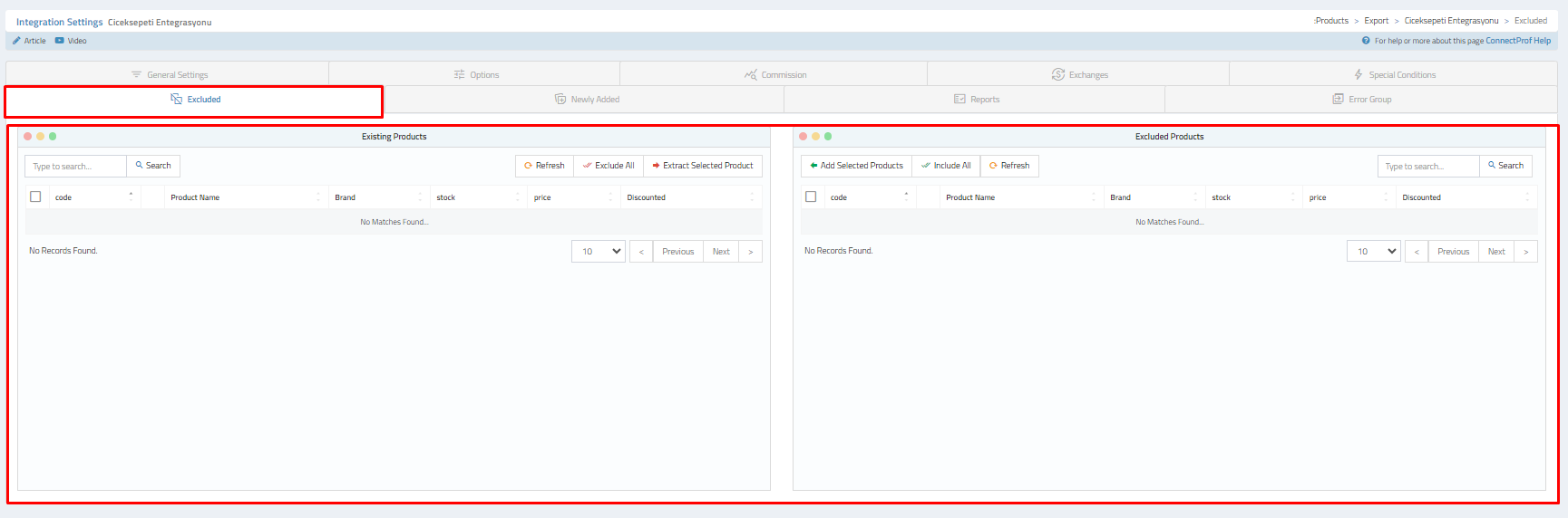 - Exclude unwanted products from being transferred to ÇiçekSepeti in the "Exclusions" section.