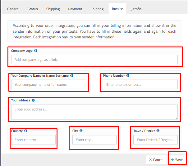 You can fill in your invoice information according to your order integration and show it in the sender information in your printouts.