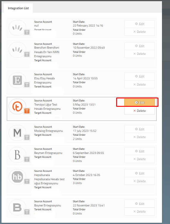 The payment method you added when creating a new order integration will be listed. You can make changes by selecting