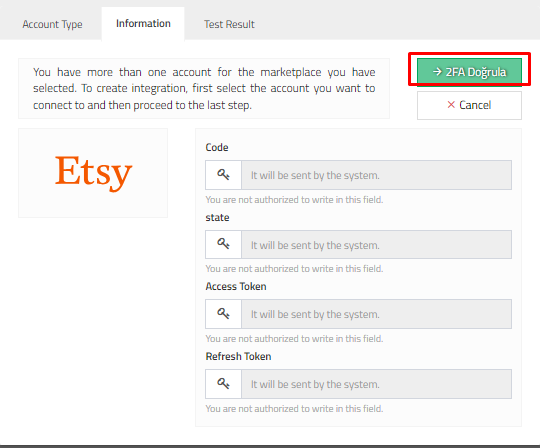 After Etsy 2FA verification, it is necessary to associate Wish with ConnectProf integration.