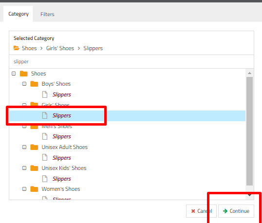 NOTE: When selecting categories, the main category should not be selected. The system will not allow mapping to the main category. Therefore, when performing category mapping, choose from the bottommost categories.