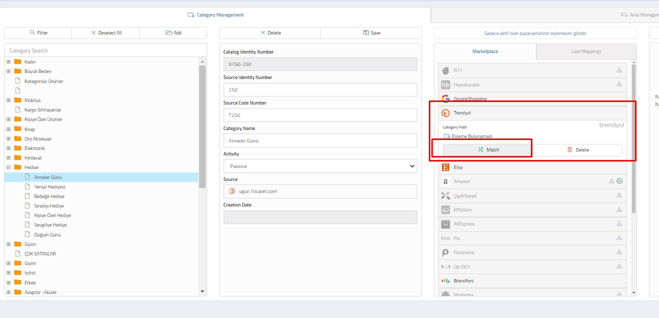 Add to Match : In the automatic matching process, the unmatched value will remain in this field. You can make manual matching with the values in the marketplace by selecting.