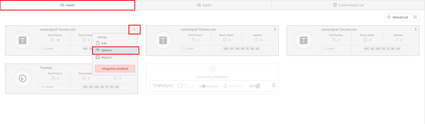 To access the settings, click on the menu of the relevant integration from the Admin Panel > Import page.