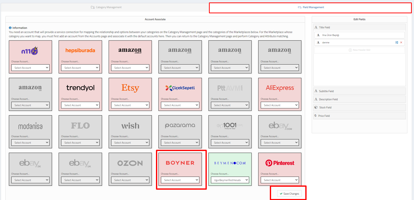 - After adding Boyner API information, associate Boyner with ConnectProf by going to Category List > Field Management > Account Association.